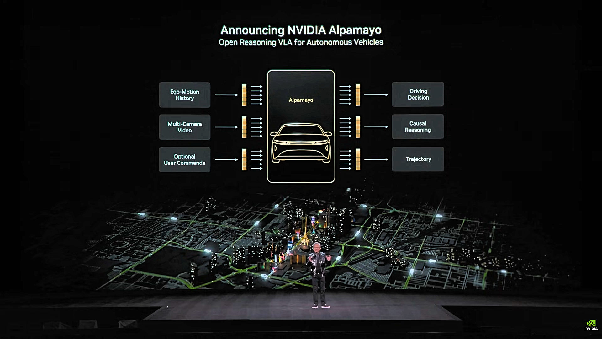 Above: A photo of NVIDIA President and CEO Jensen Huang speaking on NVIDIA's Alpamayo development at CES 2026 in Las Vegas. Photo from this video on YouTube. Used Fair Use Provision.